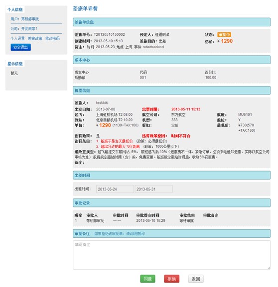 審批單查詢與管理。可設(shè)置審批權(quán)限,擁有審批權(quán)限的用戶即可審批差旅單。由成本中心來決定差旅單的審批人員??稍O(shè)置多名審批人或者獨(dú)立審批人。有差旅單需要審批時(shí)審批人會收到審批郵件或短信,可直接通過郵件來完成審批。使用戶不登錄系統(tǒng)也可能隨時(shí)隨刻輕松完成審批。