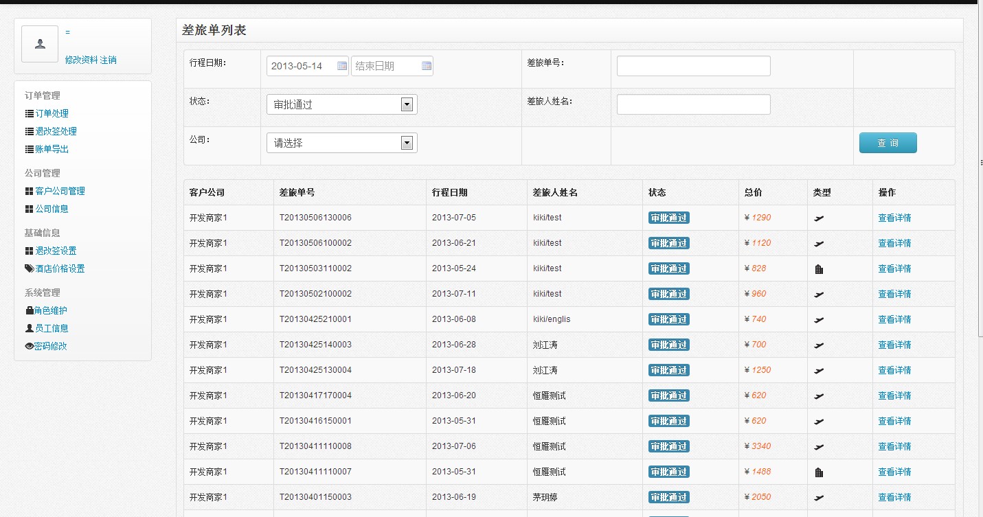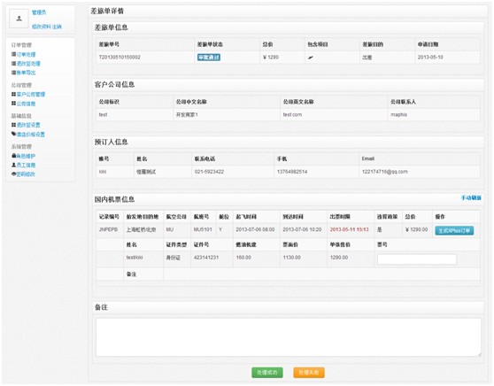 后臺可進(jìn)行訂單處理及客戶公司維護(hù)。可通過管理公司后臺添加客戶公司。前臺審批通過的差旅單會在管理公司的后臺顯示,可直接生成Xplus系統(tǒng)的訂單來出票。