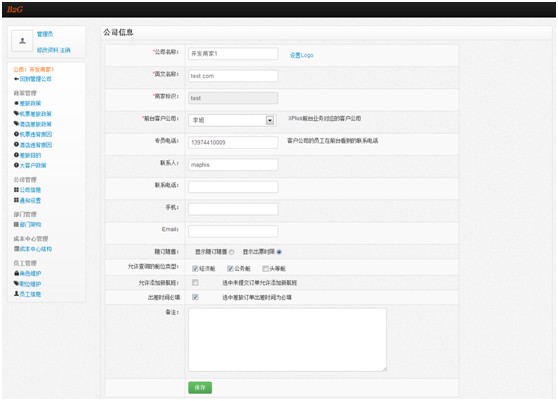 每個(gè)客戶公司都有一個(gè)獨(dú)立后臺站點(diǎn)可供公司自行維護(hù)信息??商砑佑脩?、設(shè)置差旅政策等信息。