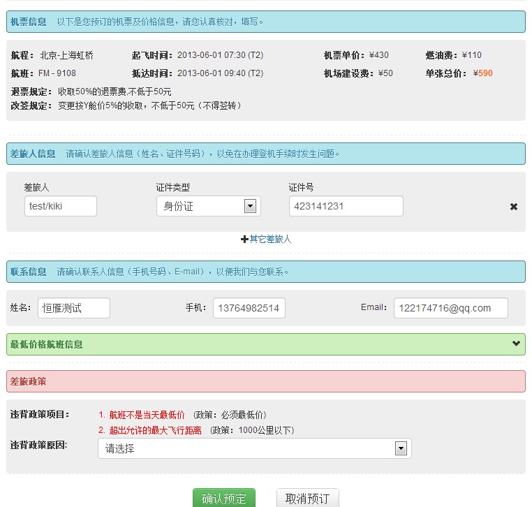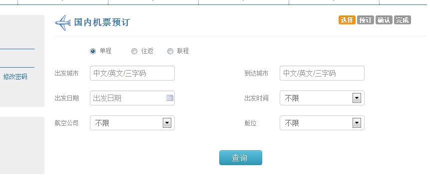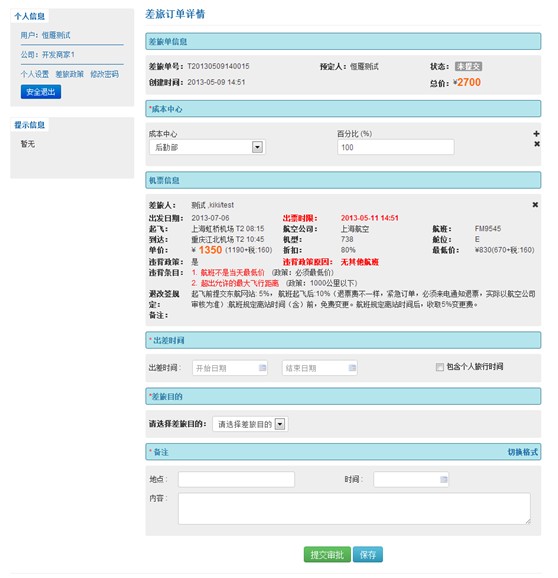系統(tǒng)提供國內(nèi)機(jī)票與酒店查詢預(yù)訂服務(wù),可通過設(shè)置用戶的差旅政策來限制用戶預(yù)訂。機(jī)票提供單程、往返及聯(lián)程查詢。